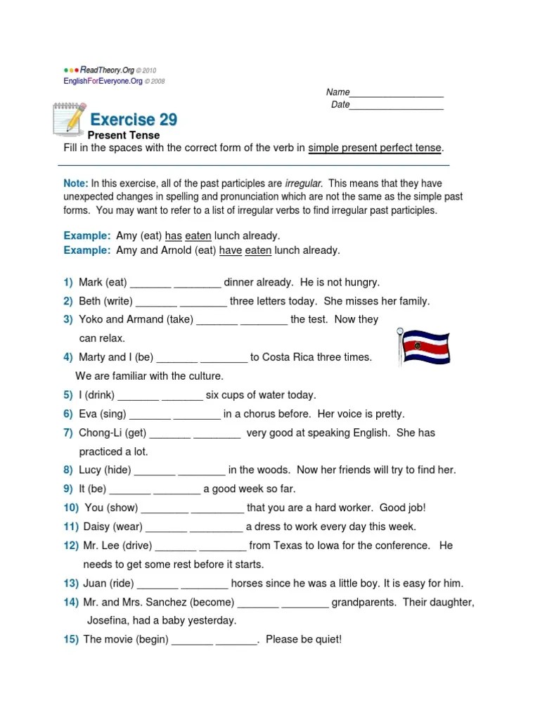 The present perfect tense is formed with the present tense form of to have plus the past participle of the verb (have been, have eaten,.). Let's practise the present perfect tense! 23.08.2019 · the present perfect isn't a verb tense unique to english, but it can still be complicated for beginning esl students to master. Examples i have had this computer for about a year. This unit contains printable present tense worksheets.